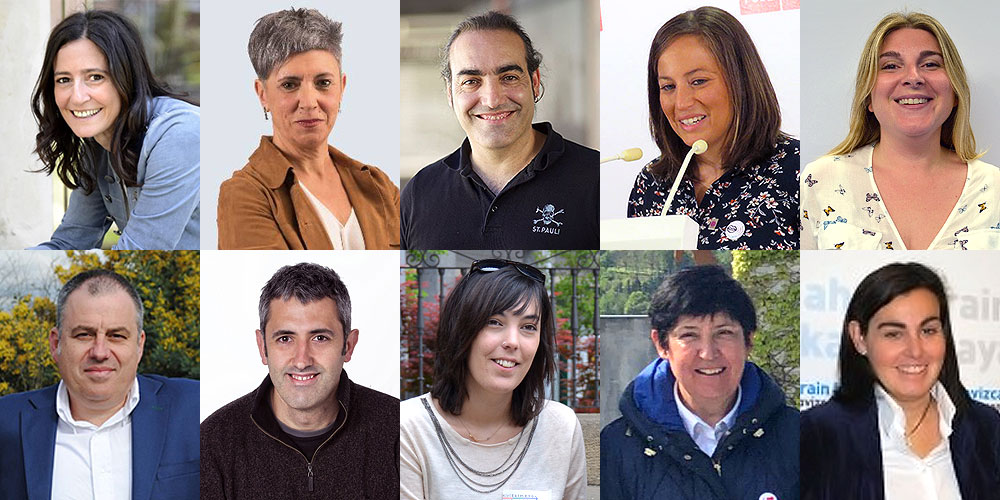 Fila superior, cabezas de lista por Durango: Mireia Elkoroiribe (EAJ-PNV), Ima Garrastatxu (EH Bildu), Julián Ríos (SQ2D), Jessica Ruiz (PSE-EE), Aiala Eguiluz (PP). Fila inferior, por Amorebieta: Andoni Agirrebeitia (EAJ-PNV), Ander Uriarte (EH Bildu), Alba Gutiérrez (Elkarrekin Podemos), Alicia Eugenia Hernández (PSE-EE), Beatriz Calvo (PP).