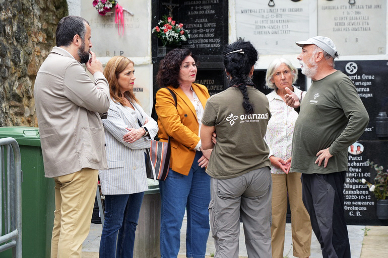 La consejera María Jesús San José, la alcaldesa de Amorebieta y miembros de Gogora y Aranzadi en el cementerio zornotzarra.