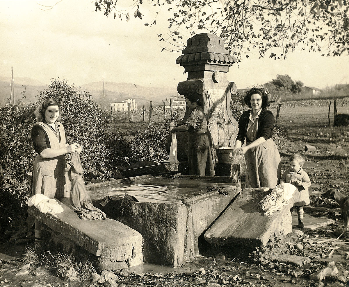 Tres mujeres en la antigua fuente de San Roke. Foto: Ricardo Doliwa /Archivo Municipal de Durango.