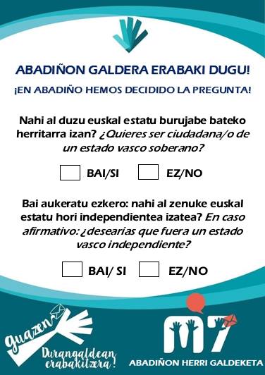 Abadiñoko Gure Esku Dago ekimenak maiatzaren 7an herrian egingo den herri-galdeketan erantzun beharreko galderak erabaki ditu, bi izango baitira herritarrek erantzun beharko dituzten galderak.
