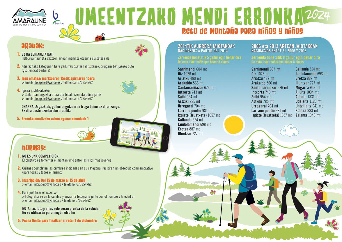Organizado en colaboración con el Ayuntamiento de Berriz, el reto se divide en dos categorías. Por un lado, niñas y niños nacidos a partir del 2014 y, por otro, las y los nacidos entre 2006 y 2013. En cada una de ellos, cada participante deberá completar el reto de hacer entre 5 y 8 cimas de los montes de la zona según su edad.