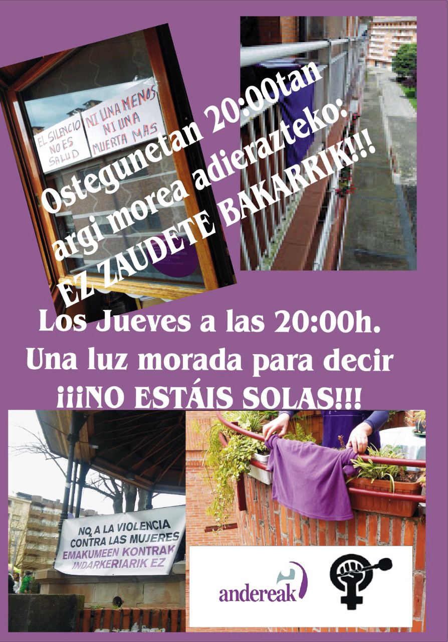 La acción propuesta en Durango comenzará esta tarde y se desarrollará  todos los jueves, después de los aplausos de las 20.00 horas. Consistirá en colocar en los balcones o ventanas una luz morada o un trapo, una camiseta o una bandera del mismo color.