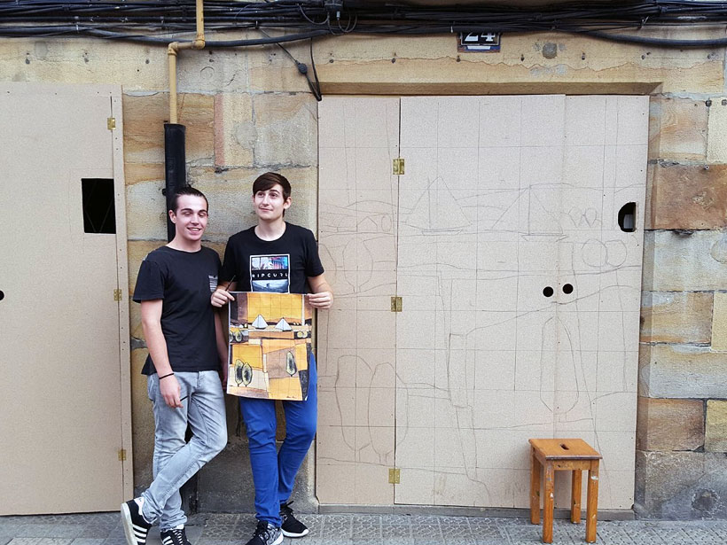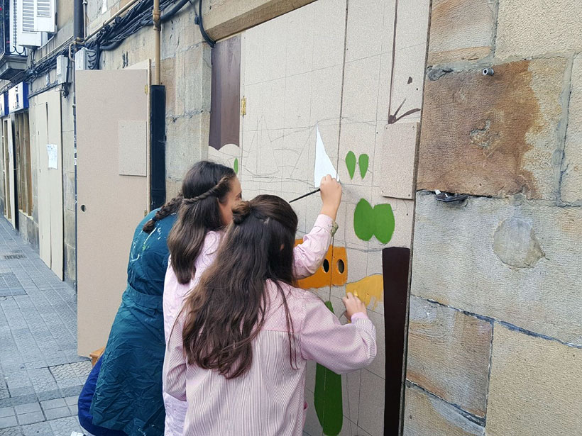 El alumnado de la Academia de Bellas Artes Kurutziaga y algún comercio de los alrededores se han contagiado de esa creatividad. Tanto es así que han cambiado los lienzos por los paneles de madera que protegen desde hace días las lunas y puertas de portales y establecimientos de esta calle con motivo de la instalación de las txosnas.