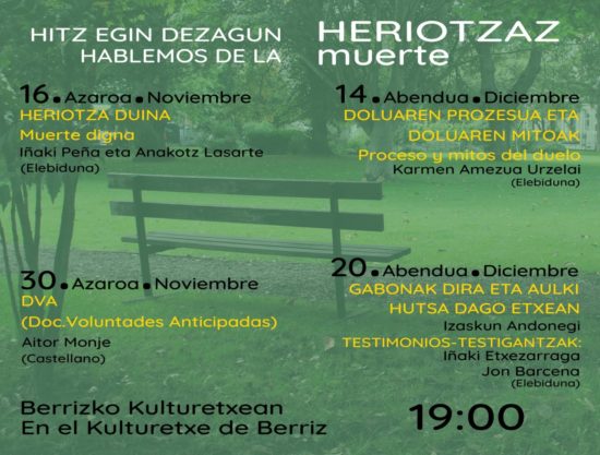 El ciclo que responde a “la necesidad de abrir espacios para poder hablar de la muerte, del final de la vida y del duelo”, arranca el próximo miércoles, 16 de noviembre, con el tema ‘Heriotza duina-Muerte de digna’ que abordarán en euskera y castellano Iñaki Peña y Anakotz Lasarte.