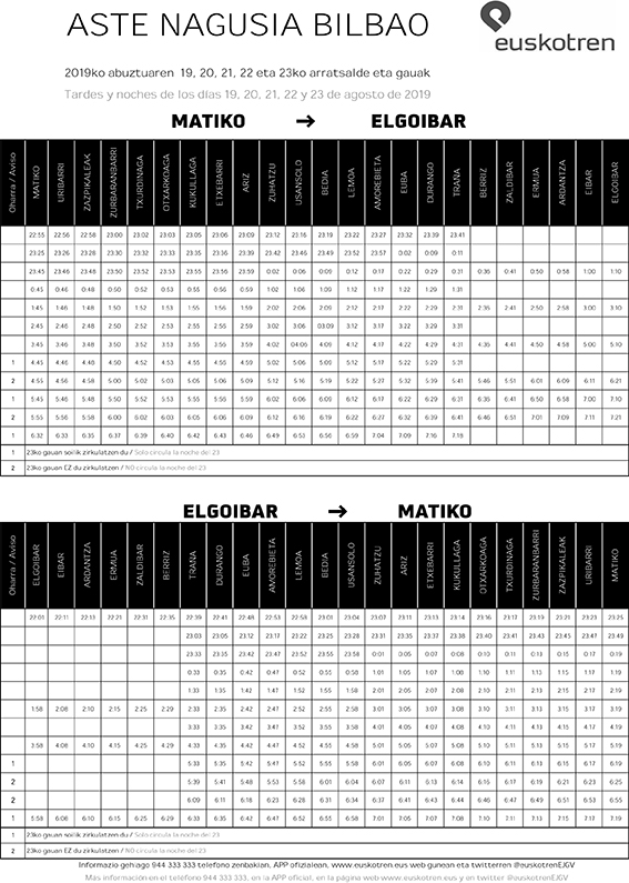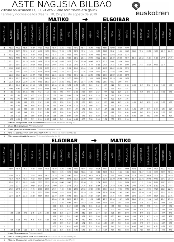Además, se habilitará un servicio para reforzar el trayecto entre Matiko –Traña-Matiena–Elgoibar, con trenes especiales durante toda la noche desde las 18:30 horas hasta las 6:30 horas.