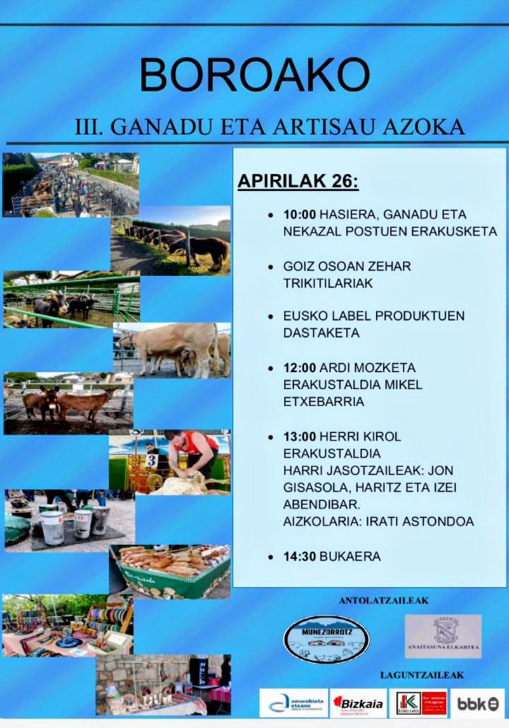 Datorren apirilaren 26an, igandea, 10:00etatik 14:30era bitartean, Boroak III. Ganadu eta Artisau Azoka hartuko du. Adin guztietarako egitaraua prestatu da, eta bertan ganadu eta nekazal postuen erakusketak, produktu dastaketak eta herri-kirol erakustaldiak izango dira protagonista.