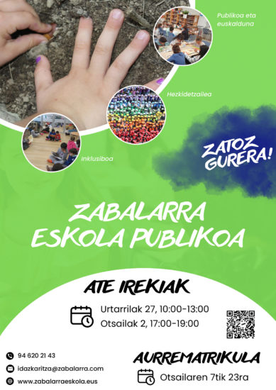 Informazio gehiagorako, www.zabalarraeskola.eus web gunea bisitatu daiteke, 946202143 telefonora deitu edo idazkaritza@zabalarra.com e-mailera idatzi.