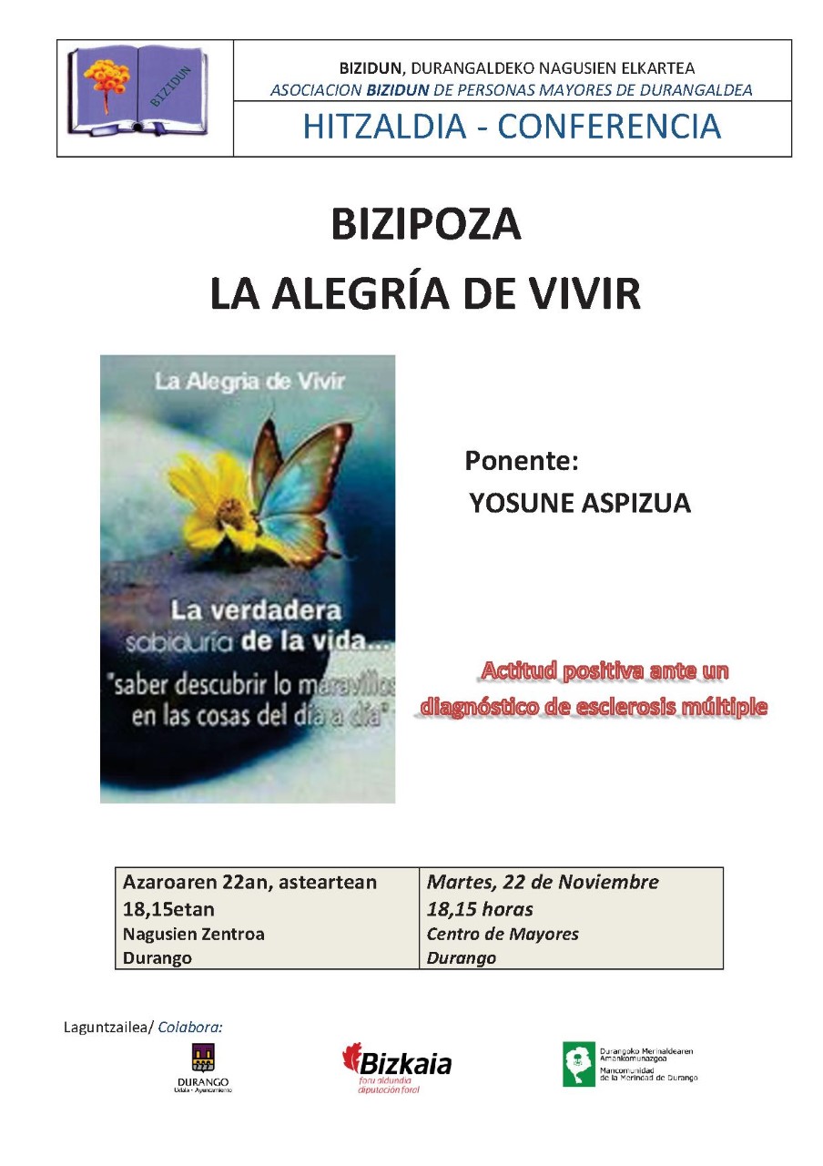 Bizidun ha organizado para mañana, martes, una conferencia que impartirá Josune Aspizua bajo el título ‘La alegría de vivir. Actitud positiva ante un diagnóstico de esclerosis múltiple’.