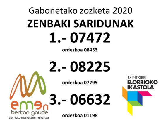 Txintxirri Ikastolak eta EME-Elorrioko Merkatarien Elkarteak astean egindako Gabonetako zozketaren zenbakiak eman dituzte ezagutzera. 1.000 euroko bonuaren irabazlea 07472 zenbakia izan da: 500 euroko bonuaren saria 08225 zenbakiarentzat izan da eta 200 euroko bonuaren saria 06632 zenbakia duenak eskuratuko du. Zozketan lehen, bigarren eta hirugarren sarien ordezkoak, hurrenez hurren, 08453, 07795 eta 01198 zenbakiak atera zituzten.