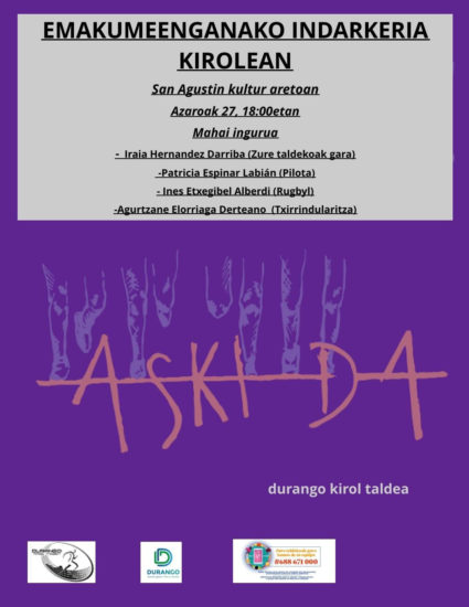 Durango Kirol Taldeak eta Udalak Emakumeen Kontrako Indarkeria Ezabatzeko Nazioarteko Egunaren harira prestatutako ekitaldian, Iraia Hernandez Darriba Zure Taldekoak Gara erakundeko kideak, Ines Etxegibel Alberdi rugbilariak, Patricia Espinar Labián pilotariak eta Agurtzane Elorriaga Derteano txirrindulari zuzendariak parte hartuko dute.