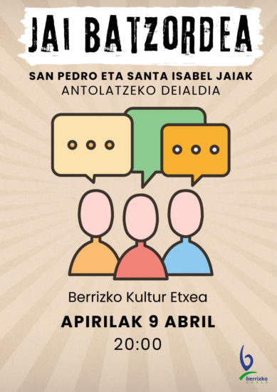Berrizko Jai Batzordeak San Pedro eta Santa Isabel jaiak antolatzeko egingo den bileran parte hartzeko deia egin die herritarrei. Bilkura gaur bertan egingo, hilak 9, da Berrizko Kultur Etxean, 20:00etan hasita.