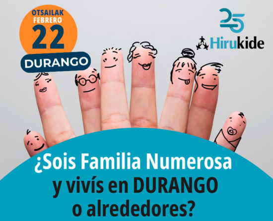 La Federación de Familias Numerosas de Euskadi, Hirukide, acudirá a Durango el próximo jueves, 22 de febrero, para informar y atender a las familias numerosas del municipio. Lo hará en una sesión informativa a las 18.00 horas en la Oficina de Información Juvenil de Intxaurrondo (Laubideta, 6).