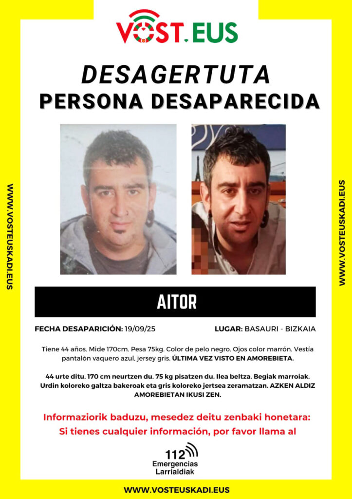 VOST Euskadi ha lanzado una alerta para pedir apoyo en la búsqueda de Aitor Varela Santamaría, de Basauri, desaparecido desde el pasado 19 de septiembre. Fue visto por última vez en Amorebieta-Etxano.