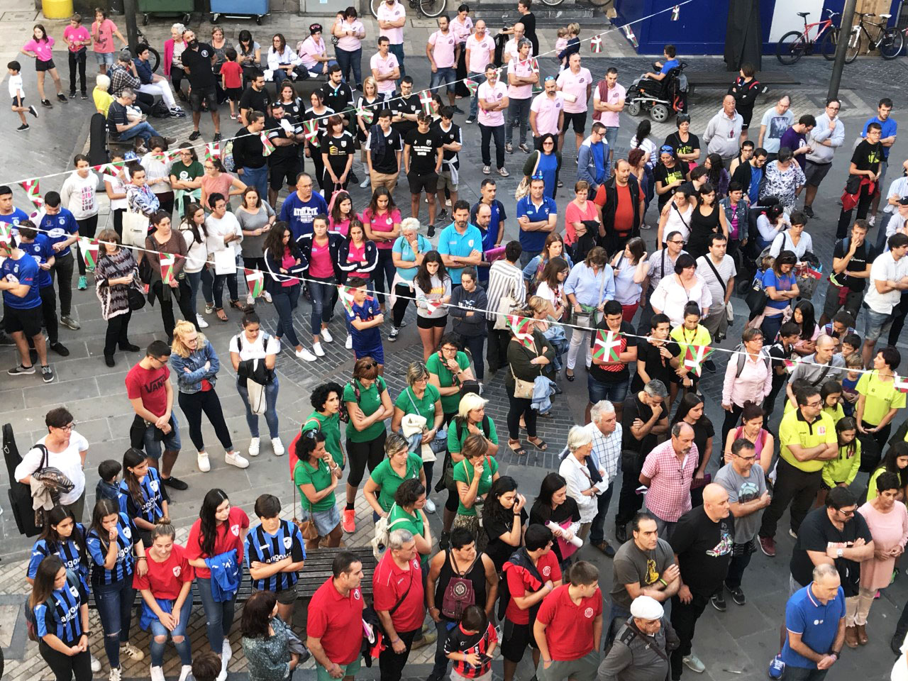 Más que cualquier otro año, en la concentración se vieron muchas camisetas de clubes deportivos y de centros escolares que quisieron simbolizar así su apoyo a una iniciativa que es pionera a nivel estatal y que busca el compromiso de toda la sociedad para hacer frente a la violencia machista en los días previos a los ‘Sanfaustos’.