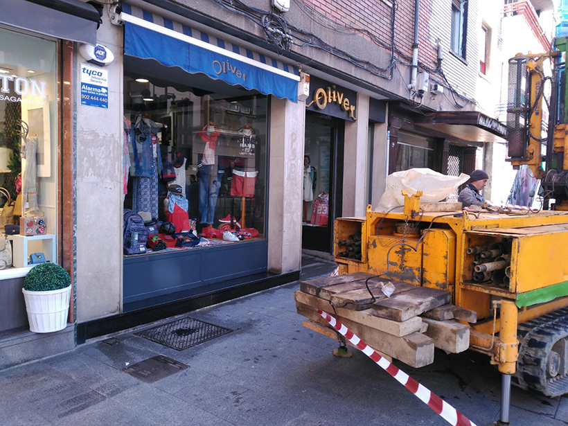 Comercios de la calle Montevideo de Durango se han vuelto a encontrar esta mañana con sus establecimientos ‘tapados’ por la maquinaria de una obra próxima.