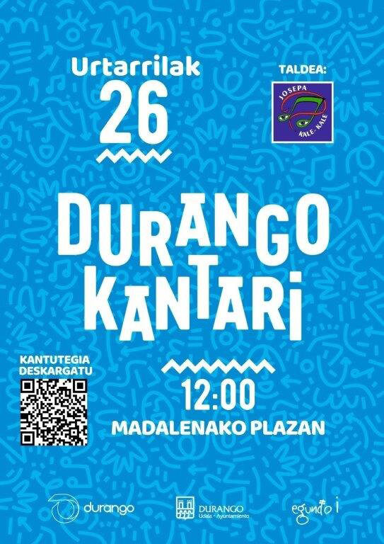 Durangoko Udalak herritar guztiak gonbidatzen ditu datorren igandean, urtarrilak 26, 12:00etan Madalena Plazan egingo den Durango Kantari jardunaldi berri batean parte hartzera. Oraingo honetan, Josepa Kale Taldea arduratuko da jardunaldia dinamizatzeaz.