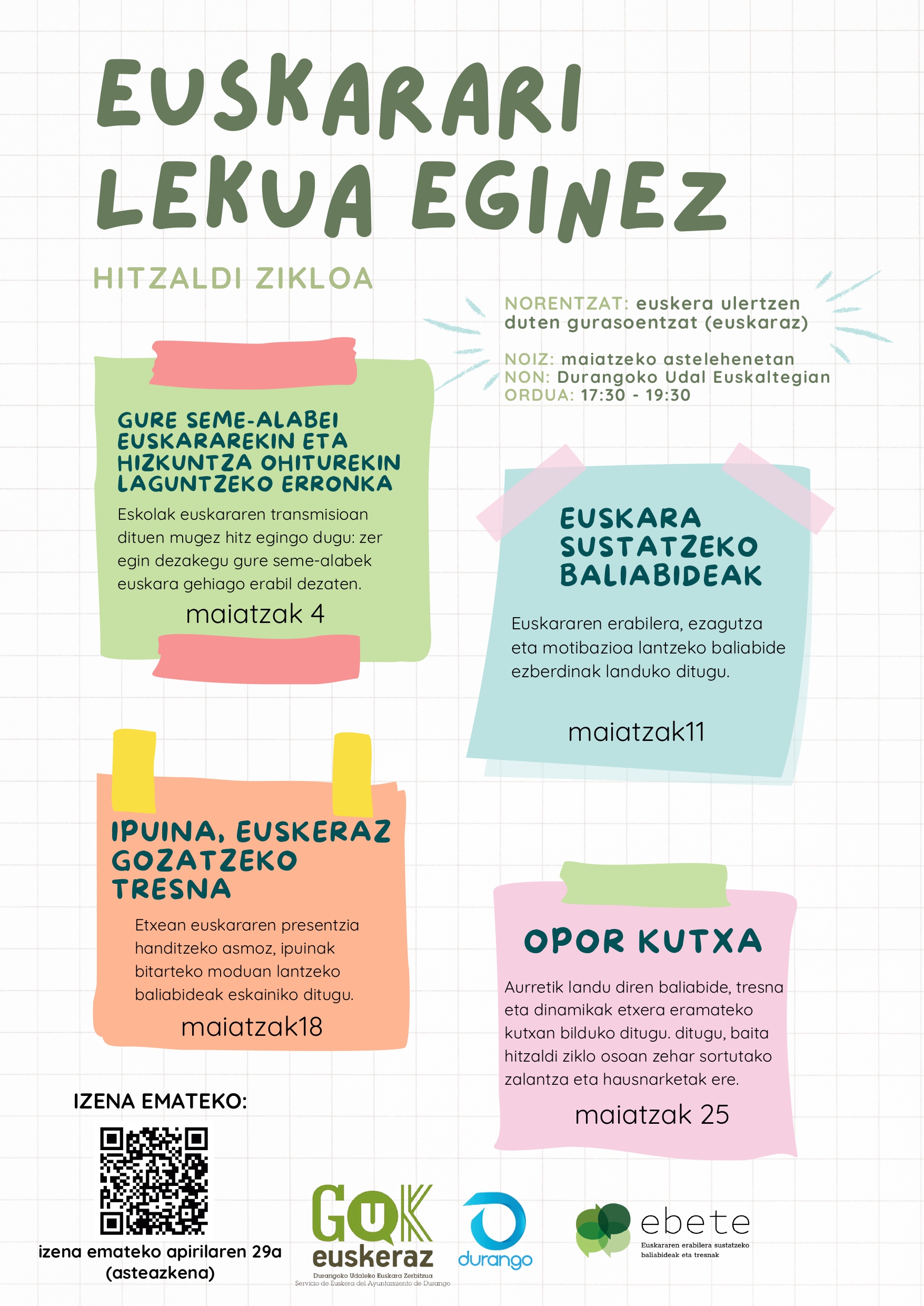 Durangoko Udalak EBETErekin batera, gurasoei zuzendutako hitzaldi ziklo bat antolatu du; alde batetik, euskara ulertzen dutenentzat, saioak euskaraz izango dira, eta, bestetik, euskara ez dakitenentzat, gaztelaniaz jarraitu ahal izango dituzte. Horrela, ikuspegi inklusiboa eta hainbat errealitate linguistikotara egokitua bermatzen da. Ekimenaren helburua da euskarak familian duen presentzia eta erabilera indartzea, eta hizkuntza ohiturei eta seme-alaben hizkuntzarekiko harremanari buruzko hausnarketa eta ikaskuntza gune bat proposatzen du.