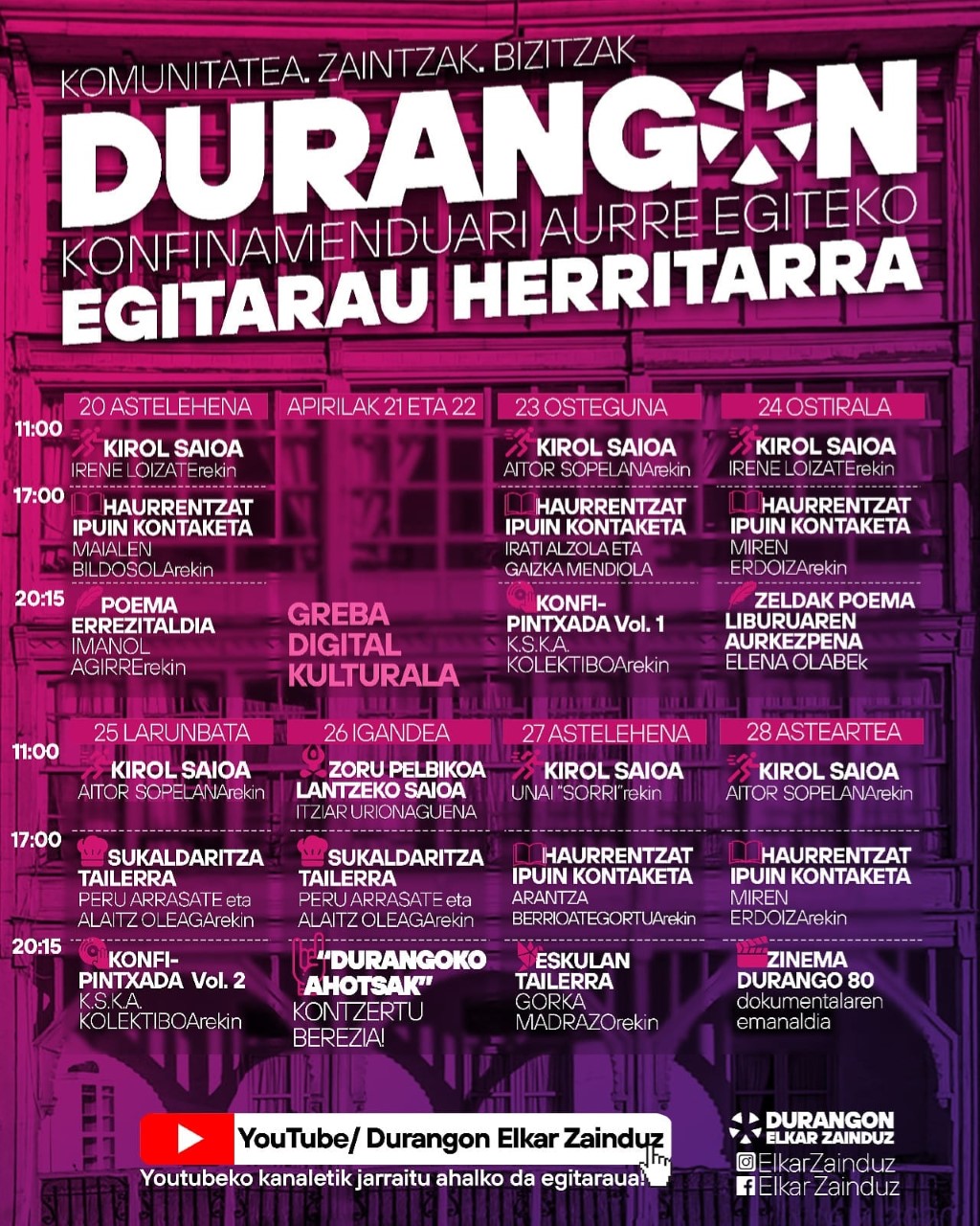 La red popular de cuidados Durangon Elkar Zainduz ha organizado una programación popular con la ayuda de vecinos y vecinas de la localidad que se podrá seguir por su canal de Youtube. Las actividades comenzarán el lunes e incluirá talleres de cocina, cuentacuentos infantiles, sesiones de deporte, DJs y un concierto especial.