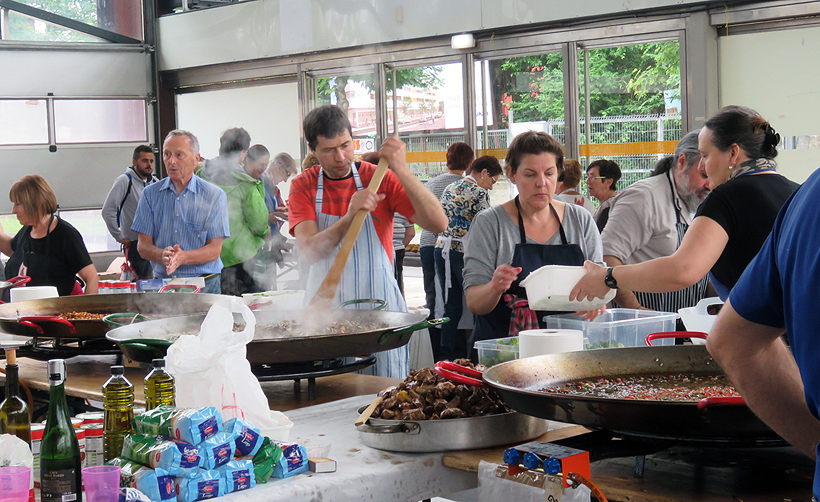De la comida se han encargado los txokos de Durango, cuyos cocineros se han pasado buena parte de la mañana detrás de los fogones para preparar paella para 1.200 personas. Ahí es nada.