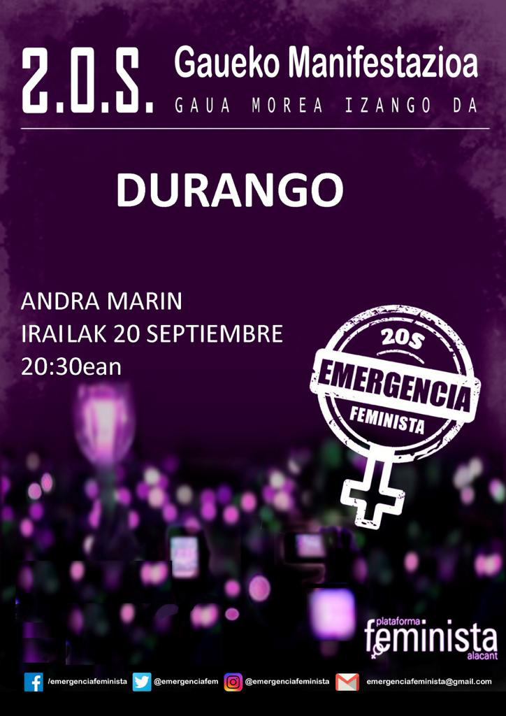 Es por ello que desde Andereak y Batukandra piden a la población de Durango y la comarca “llenar las calles de feminismo para que nos vean y para gritar que no tenemos miedo». La cita es el viernes, 20 de septiembre, a las 20.30 horas en el pórtico de Andra Mari.
