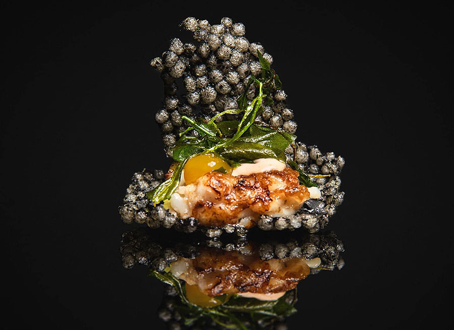 La base del pintxo elaborado por los hermanos Koldo e Iñigo Kortabitarte es un crujiente de tinta, con txipirón envuelto en papada ibérica adobada y ahumada, gel de maracuyá, mahonesa de gamba roja y rúcula frita. Terminado con otro crujiente, ‘Una de txipis’ se cierra como un bocadillo y se come.