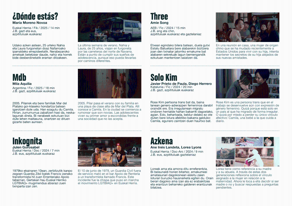 También se exhibirá ‘Solo Kim’ (Catalunya), de Javier Prieto de Paula y Diego Herrero, sobre la experiencia de una persona trans en situación de migración irregular; ‘Inkognita’ (Euskal Herria), de Julen Gorosabel, un documental que revive el asesinato de un transformista en 1979 en Errenteria, hecho clave en la historia del movimiento LGTBIQ+ en Euskal Herria; y ‘Azkena’ (Euskal Herria), de Ane Inés Landeta y Lorea Lyons, una pieza documental-animada que reflexiona sobre los vínculos familiares y la maternidad desde una óptica feminista.