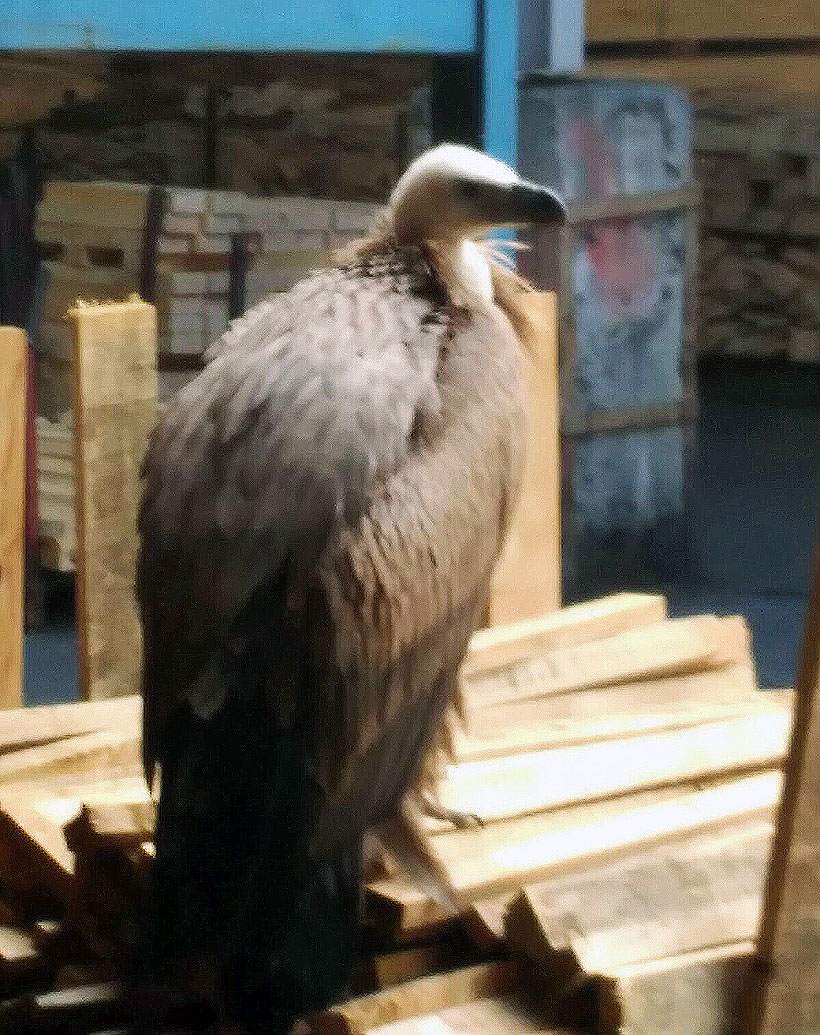 Empleados de la serrería Mintegui de Abadiño han encontrado esta mañana un buitre en sus instalaciones.  Para cuando han ido a trabajar, hacia las 8.00 horas, ya se encontraba allí.