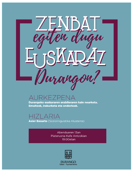 EuskarazDurangonDurangoko Udalak euskararen erabileraren inguruko datuak aurkeztuko ditu bihar, arratsaldeko 19:00etan Plateruena Kafe Antzokian, ‘‘Zenbat egiten dugu euskaraz Durangon?’ izenburupean egingo den ekitaldian.