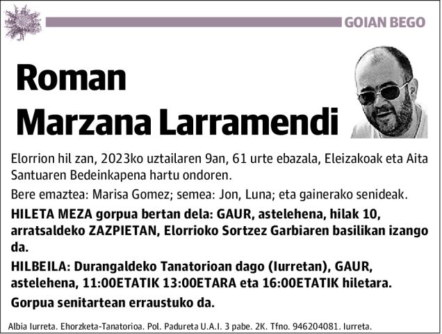 El que fuera alcalde electo de Elorrio por el PNV, Román Marzana Larramendi, falleció ayer a la edad de 61 años. El funeral se ha celebrado esta tarde en la basílica de la Purísima Concepción de Elorrio.
