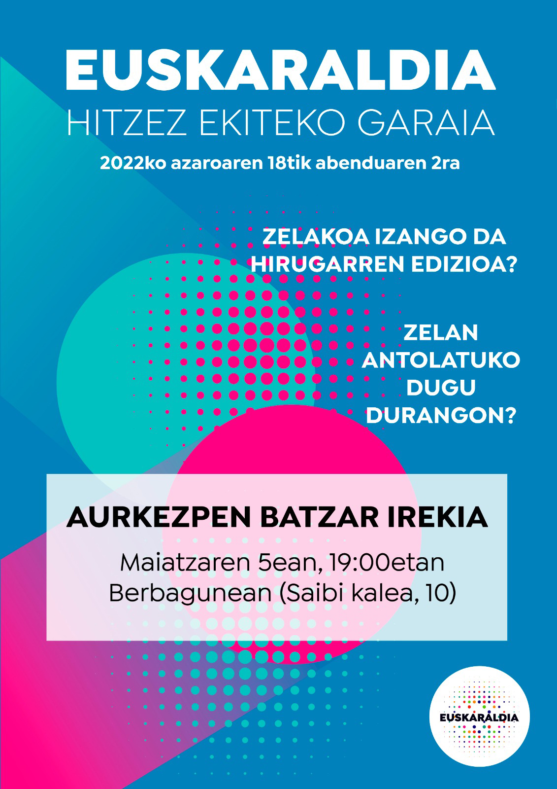 Bilera horretan, alde batetik, Euskaraldiko edizio honen nobedadeak eta nondik-norakoak azalduko dira, eta bestetik, Durangon herri batzordeak egin beharreko lanak zeintzuk diren azalduko da, eta interesa duenak bertan zelan parte hartu edo lagundu dezakeen.