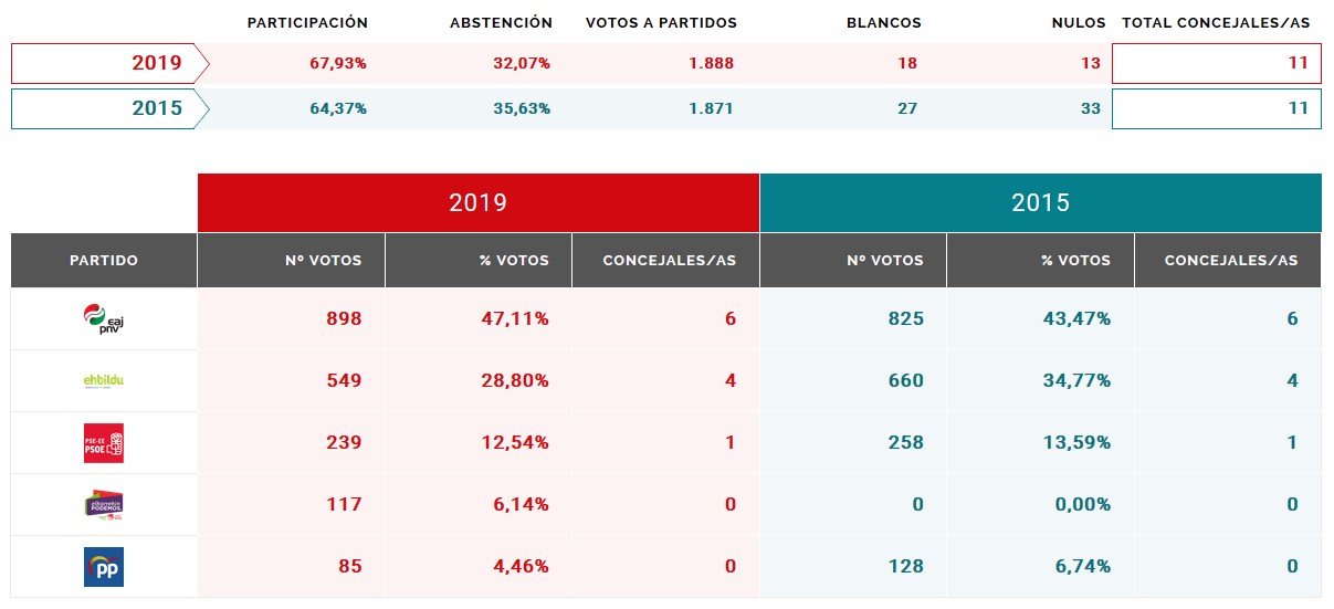 La formación jeltzale conserva sus seis concejales, EH repite con cuatro ediles y el PSE-EE mantiene a su única representante.