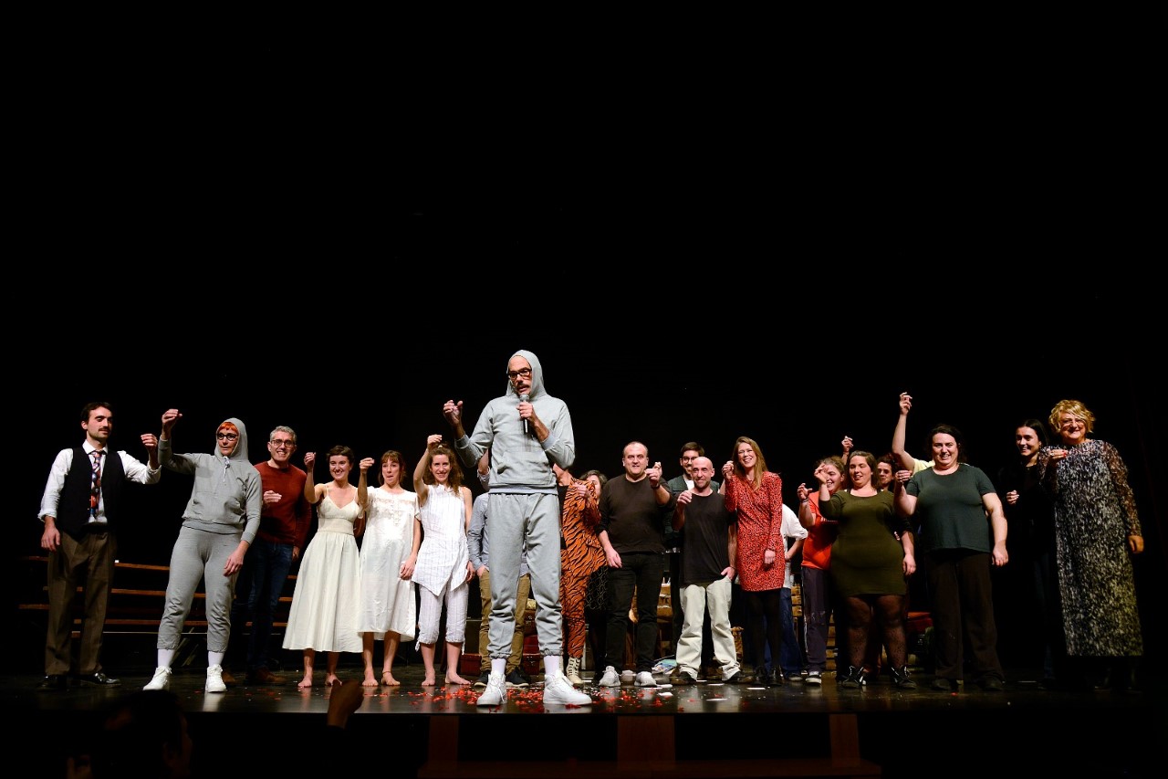 Gorka Ganso, Arantza Arrazola, trabajadores e integrantes de las compañías residentes en San Agustín sobre el escenario. FOTOS: TXELU ANGOITIA.