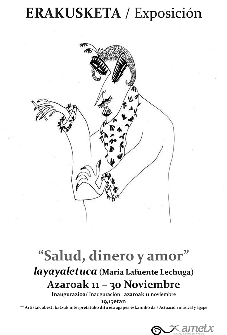 AmorebietaSaludDineroAmorCartelEl centro Zelaieta de Amorebieta-Etxano acoge hasta el 30 de noviembre la exposición de ilustraciones humorísticas ‘Salud, dinero y amor’ de la artista madrileña Layayaletuca, alter ego de María Lafuente Lechuga (1993).