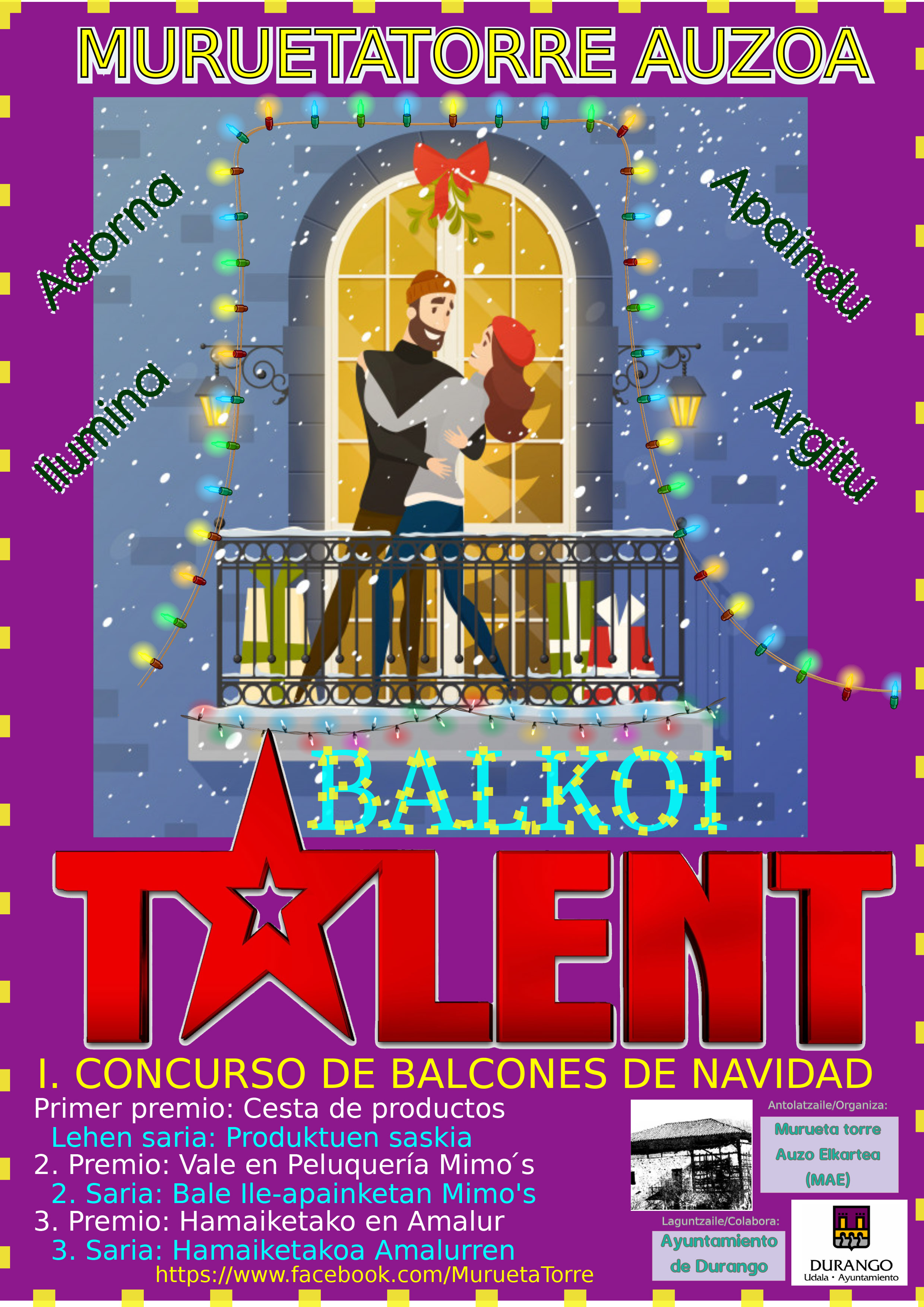 Muruetatorre Auzo Elkartea ha organizado su primer Concurso de Balcones para contribuir al ambiente festivo navideño del barrio y de todo Durango. Podrán participar en la iniciativa todas las vecinas y vecinos que lo deseen, de forma gratuita, con la única condición de que la decoración sea visible desde la calle entre el 20 de diciembre y el 6 de enero.
