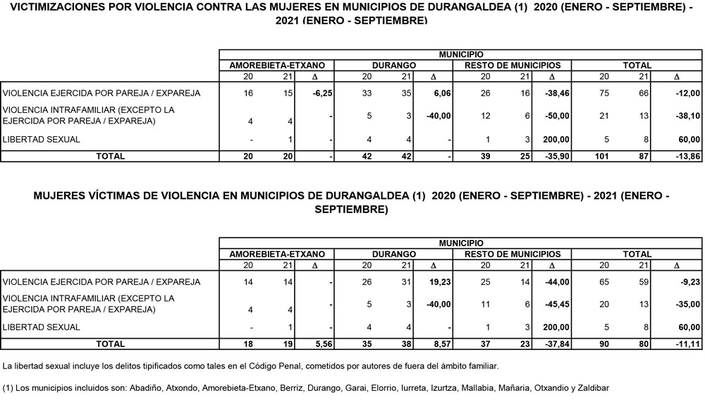 La violencia intrafamiliar ha provocado 13 denuncias, con un descenso del 38,1%, mientras que las correspondientes a delitos contra la libertad sexual han sido 8, tres más que el año pasado. Cuatro de estas denuncias han sido presentadas en Durango y una en Amorebieta-Etxano.
