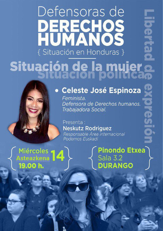 La activista Celeste Espinoza visitará mañana a Durango para hablar de la situación política, la libertad de expresión y los Derechos Humanos en Honduras. Su charla, que será a las siete de la tarde en la sala 3.2 de Pinondo Etxea, será presentada por la juntera Neskutz Rodríguez, responsable del área internacional de Podemos Euskadi.