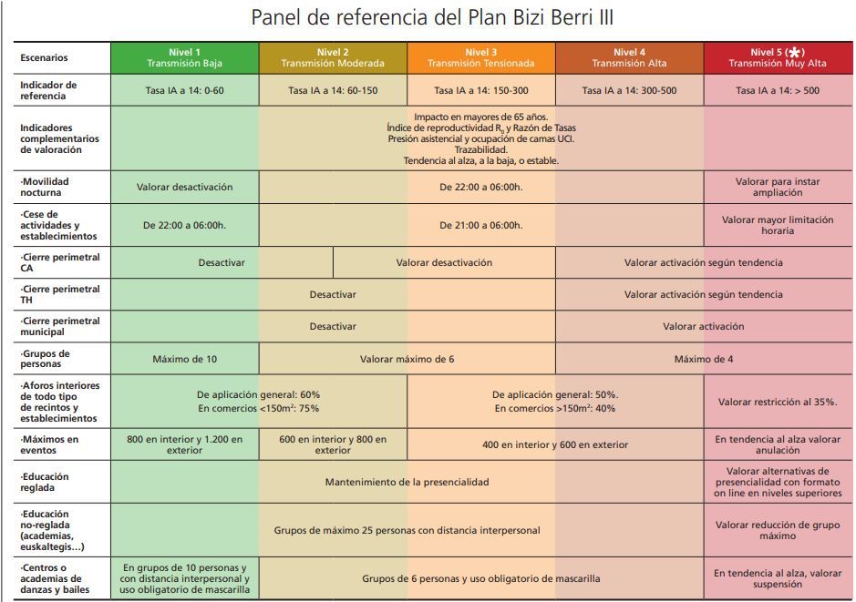 El plan Bizi Berri III prevé cinco escenarios, indicadores y medidas preventivas adaptadas a cada nivel de riesgo. Con un índice de entre 150 y 300 contagios por cada 100.000 habitantes (Transmisión Tensionada) también se prevé valorar las reuniones de hasta 6 personas. Entre 60 y 150 contagios (Transmisión Moderada) se planteará un aumento del aforo en recintos y comercios y la apertura de la Comunidad y, por debajo de 60, ya en zona verde, se procederá a la desactivación de la movilidad nocturna, se ampliarán los horarios de actividades y establecimientos, y se permitirán grupos de hasta 10 personas en reuniones sociales y en centros o academias de danza y baile.