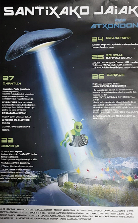 AtxondoSantiagoJaiak2019Atxondoko Santixa auzoak paraje horri izena ematen dion santuaren jaiak ospatuko ditu bihartik domekara bitartean. Prestatutako egitarauari hasiera emateko txopo txikiaren apainketa eta txopoa jasotzeari ekingo diote bihar ilunkeran eta jarraian berakatz zopa dastatzeko aukera izango dute bertaratzen direnek.
