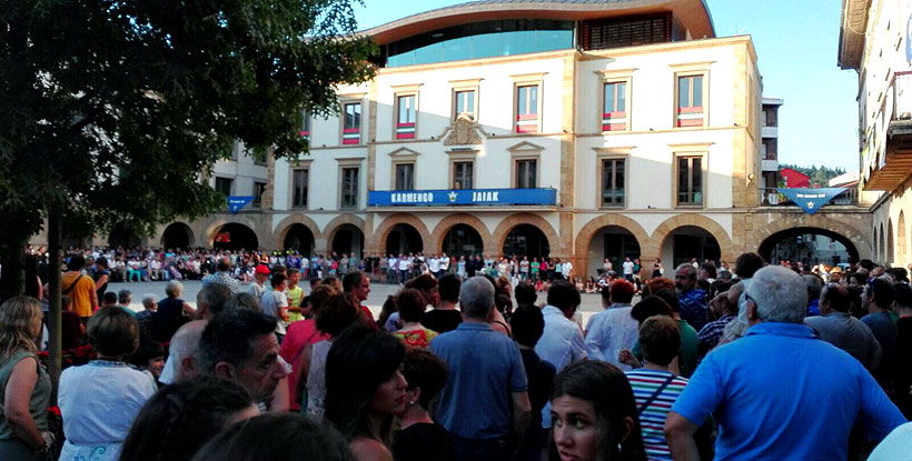 La respuesta de la población  ha sido contundente. Con el alcalde, Andoni Agirrebeitia y ediles de todas las fuerzas políticas situados bajo el balcón consistorial, el gentío ha completado un círculo alrededor de la Herriko Plaza para expresar su más absoluto rechazo a la violencia machista.