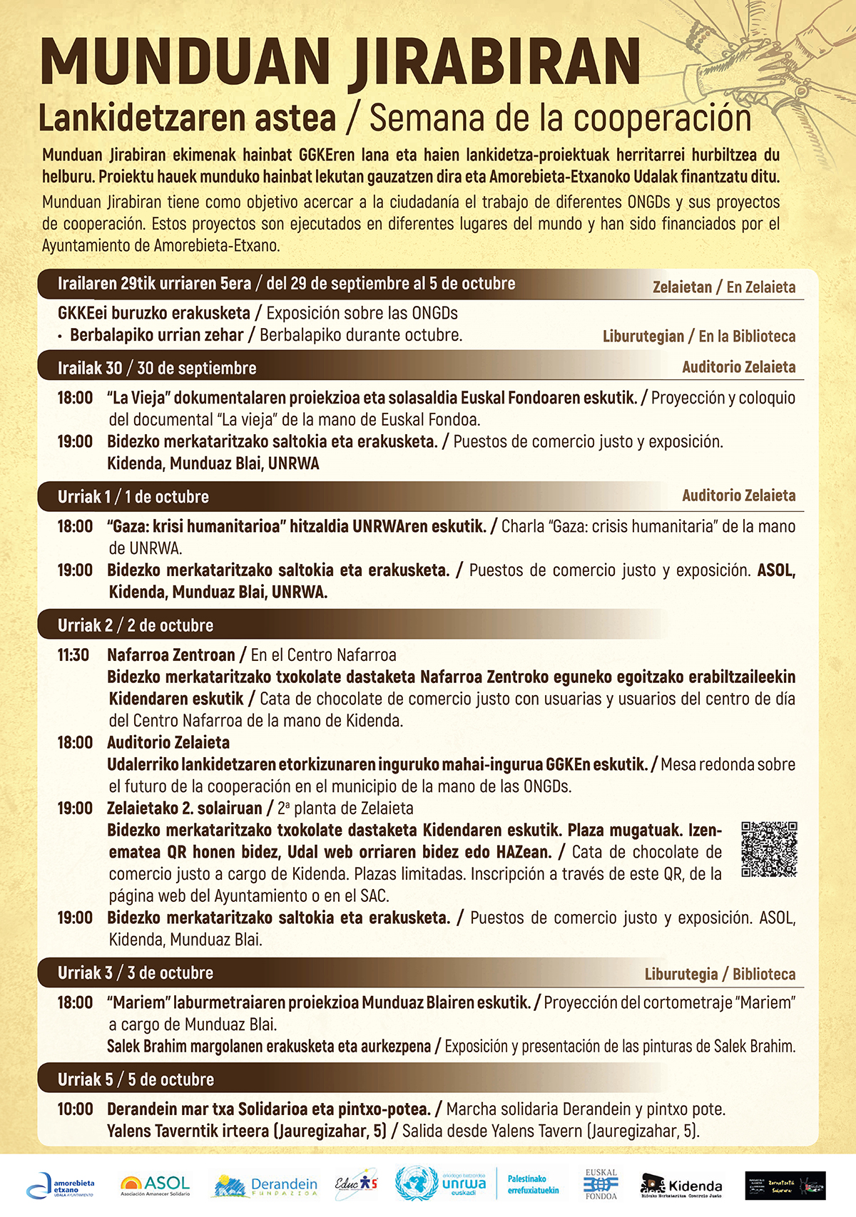 Munduan Jirabiran lelopean Amorebieta-Etxanok Lankidetzaren Astea ospatuko du aurten bigarren urtez, hainbat GGKEk munduko toki desberdinetan egiten dituzten garapenerako lankidetza proiektuak herritarrei hurbiltzeko helburuz. Edizio berri hau irailaren 29tik urriaren 5era izango da, eta jarduera kultural, hezitzaile eta parte-hartzailez betetako egitaraua izango du.