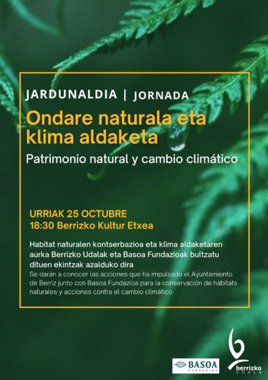 Berrizko Udalak natura-ondareari eta  klima-aldaketari buruzko jardunaldia antolatu du biharko, arratsaldeko 18:30ean hasita,  Berrizko Kultur Etxean. Ekimena Basoa Fundazioarekin elkarlanean antolatuta dago.