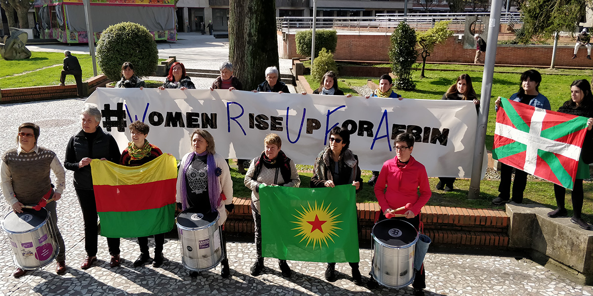 Por ello, cuando Turquía invadió Afrin Kongreya Star (el mayor Movimiento de Mujeres de Siria) hizo un llamamiento internacional de solidaridad bajo el lema “Women Rise Up For Rojava” (Mujeres levantémonos por Rojava). En Durango, haciendo gala del hermanamiento, realizamos una acción de solidaridad. El vídeo de esta acción lo mandamos a nuestras hermanas de Rojava para el 8 de Marzo. Además, el Ayuntamiento de Durango realizó una declaración institucional y colocó en el balcón del Ayuntamiento las banderas de Rojava, YPJ e YPG, a modo de solidaridad.