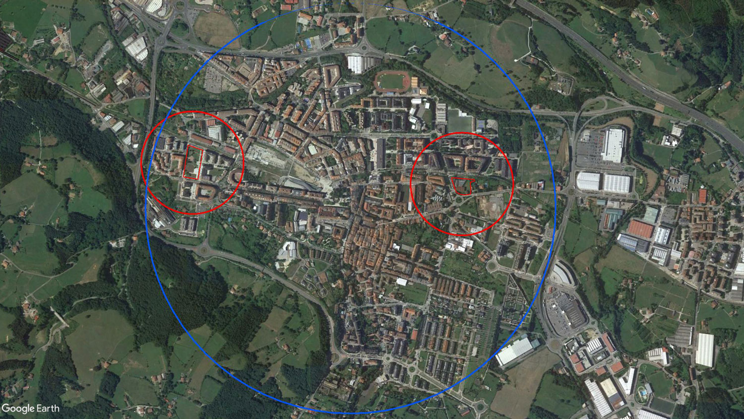 C los círculos están trazados con las herramientas de medición de Google earth, es probable que a ti te cueste entender las herramientas SIG, y no pases de hacer la o con un canuto.