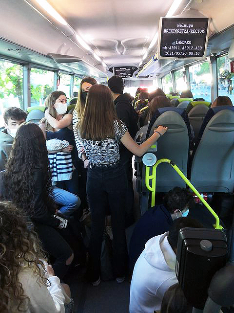 “Me gustaría denunciar la situación en la línea de Bizkaibus Durango-UPV/EHU. Os envío esta foto tomada en el servicio de hoy de las 08:10 horas, en el que han suprimido uno de los autobuses, con el resultado que se ve. Parece que Bizkaibus y la Diputación ya han dado la pandemia por superada”.