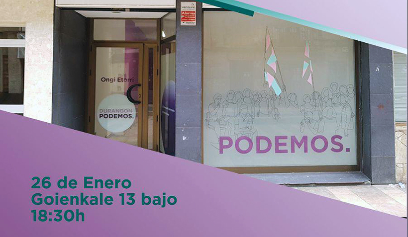 Podemos inaugura esta tarde, a las 18.30 horas, su sede para Durangaldea en el número 13 de Goienkale. Con ese motivo, invita a todos los vecinos y vecinas de la comarca a a participar en el acto.