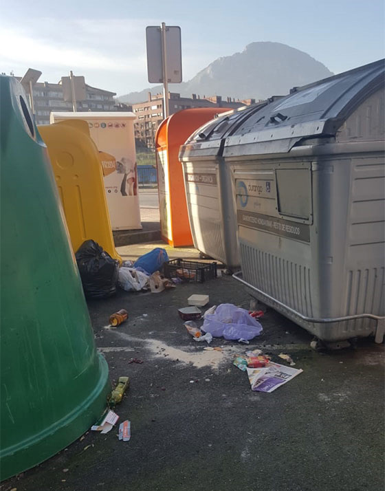 La función fundamental de los contenedores de residuos es albergar los desechos en su interior. Algo que, desgraciadamente, no siempre se cumple, como denuncia con esta imagen una vecina de Durango.