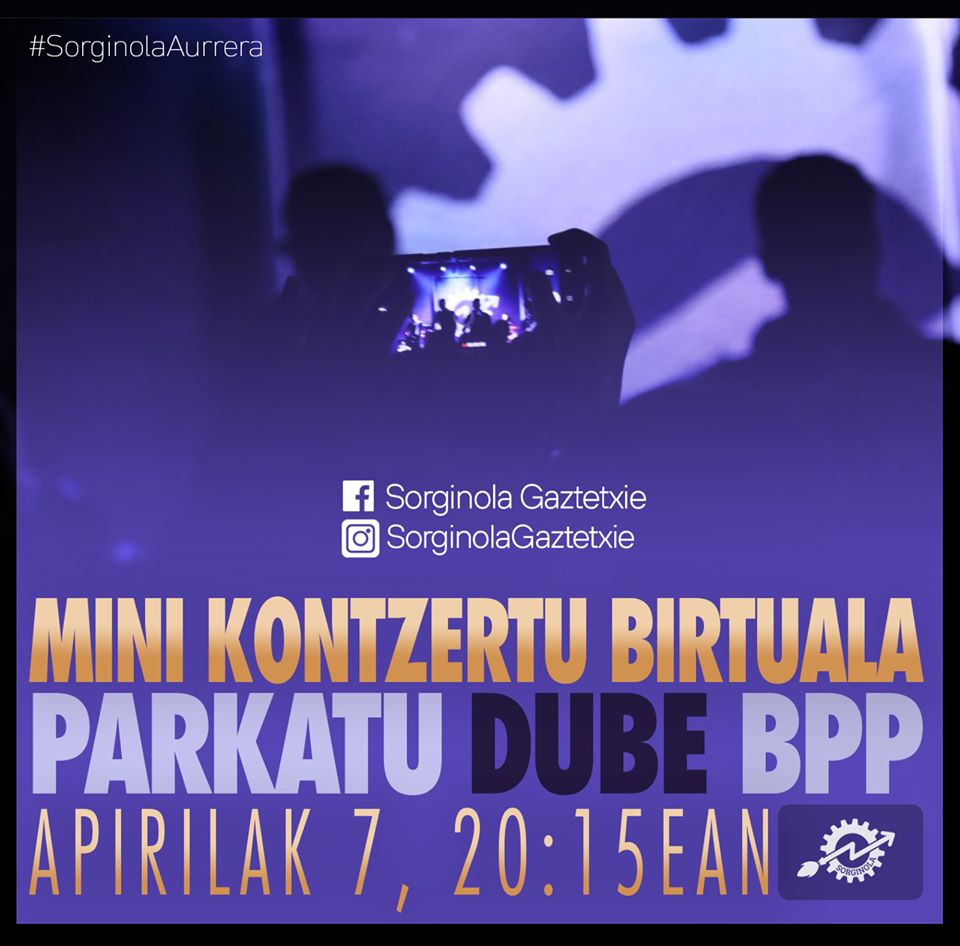 Gaur iluntzerako iragarritako minikontzertua 20:15ak aldera hasiko da eta ekitaldian parte hartuko duten Parkatu eta DUBE taldeek Sorginolan kontzertua ematekotan ziren pasa den astean. Baina koronabirusarengatik agindutako konfinamendua dela eta, agerraldia bertan behera geratu zen.