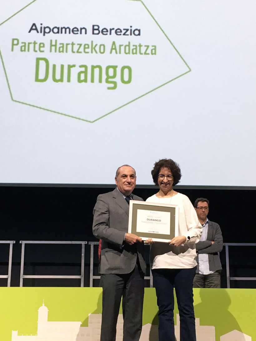La red de municipios Udalsarea 21 ha otorgado a Durango la mención especial al fomento de la participación pública y la transparencia por “conseguir integrar progresivamente a la ciudadanía y a los agentes sociales y económicos a través de canales estables de participación que cuentan con implicación técnica y política”. El consejero de Medio Ambiente, Planificación Territorial y Vivienda, Iñaki Arriola, hizo entrega ayer del galardón a la alcaldesa de Durango, Aitziber Irigoras.