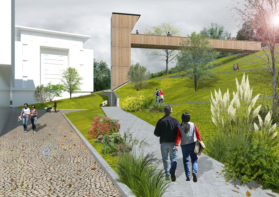 También se rediseñarán el ámbito inferior para favorecer la llegada y visibilidad de la estructura, y la zona del desnivel, en el que se colocará un mosaico vegetal con varias especies. En el ámbito superior, la llegada de la pasarela se ha planteado coincidente con un nuevo paso de peatones que cruce el vial de Santa Ana.