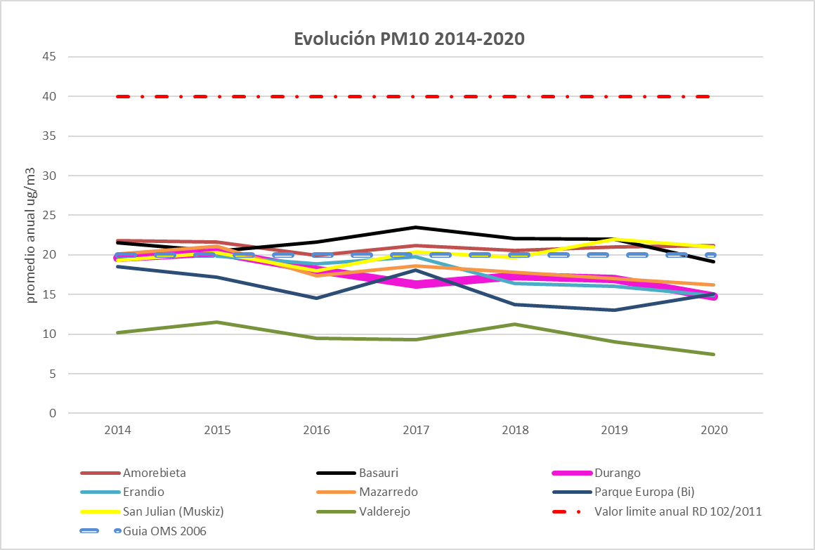 El Gobierno vasco destaca, además, que desde 2015 se cumplen los niveles guía de la OMS y en 2020 el valor medio alcanzado ha sido de 15 microgramos por metro cúbico (µg/m3), “una tendencia que estos últimos años es claramente a la baja”. Añade que el valor de partículas PM10 en la estación de Durango “está experimentando un descenso cuya tendencia alcanza los valores establecidos por la OMS en 2021 de 15 microgramos por metro cúbico (µg/m3)”.